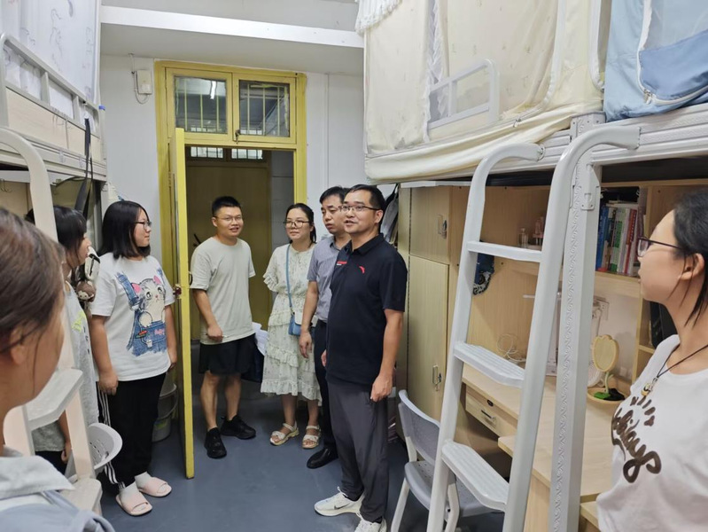 随后,学院领导与老师们逐一走进学生宿舍,与同学们展开亲切而深入的交流。他们细致询问了同学们返校后的学习与生活安排,同学们也热情分享了假期的所见所闻及归校后的感受;老师们耐心倾听,并鼓励同学们迅速调整状态,以更加饱满的热情和昂扬的斗志迎接新的学习挑战。