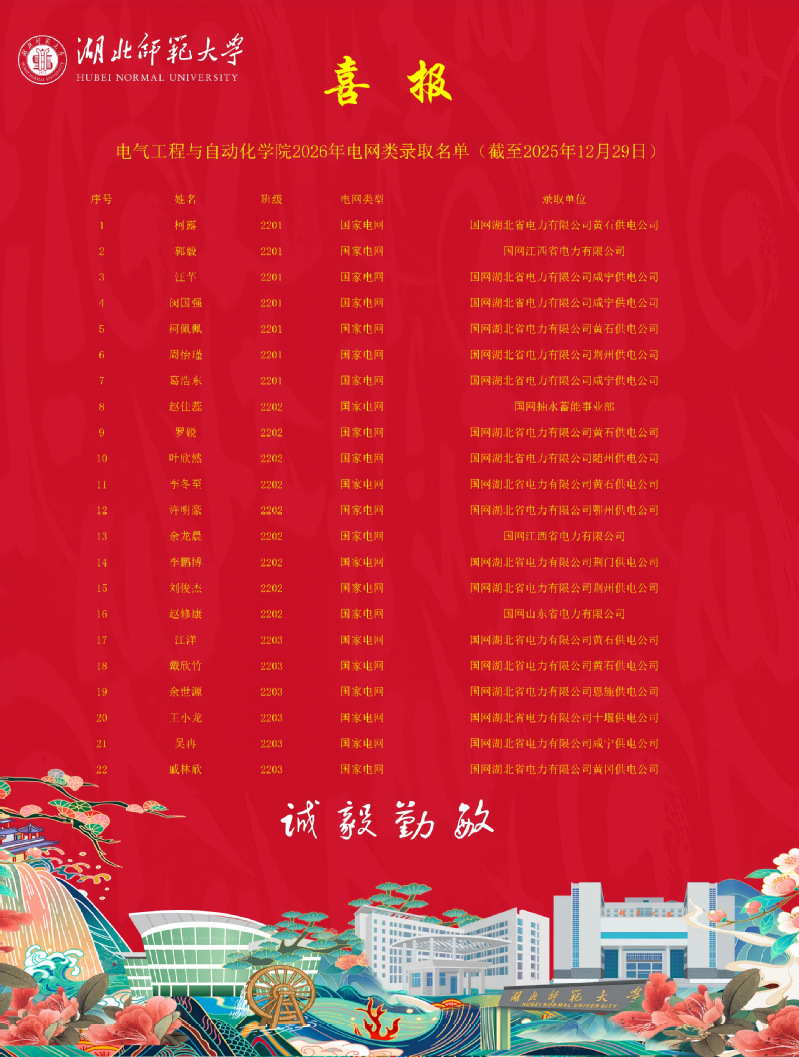 近日,随着国家电网各下属公司2026届高校毕业生考试招录结果陆续揭晓,yl23455永利官网,yl23455永利官网毕业生在电网类国企招聘中再创辉煌。本次学院共有22名毕业生成功斩获电网类国企录用资格,其中18人签约国网湖北省电力有限公司,两类录用人数均刷新历史纪录,为学院毕业生高质量就业工作再添浓墨重彩的一笔,彰显出学院人才培养与就业工作的扎实成效。